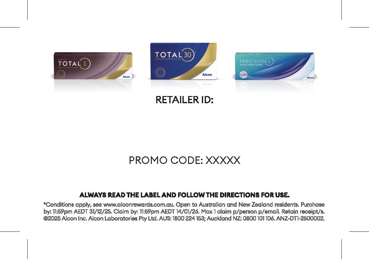 To be eligible to claim, claimants must purchase, in a single transaction, their first 3-month supply of TOTAL1™ or PRECISION1™ (2 x 90 packs) or 6-month supply of TOTAL30™ contact lenses (2 x 6 packs or 4 x 3 packs) of a “Participating Product” from a “Participating Retailer” between 01/10/2025 and 31/03/2026.